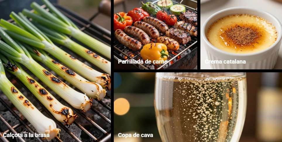16 calçots + parrillada de carne (butifarra+ morcilla +chorizo+ panceta+ pollo) con all i oli y patatas fritas o caliu + crema catalana + vino/casera + 1 copa de cava.