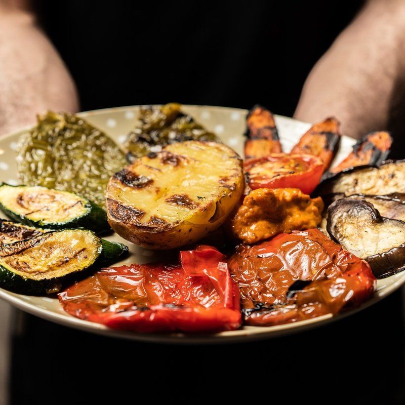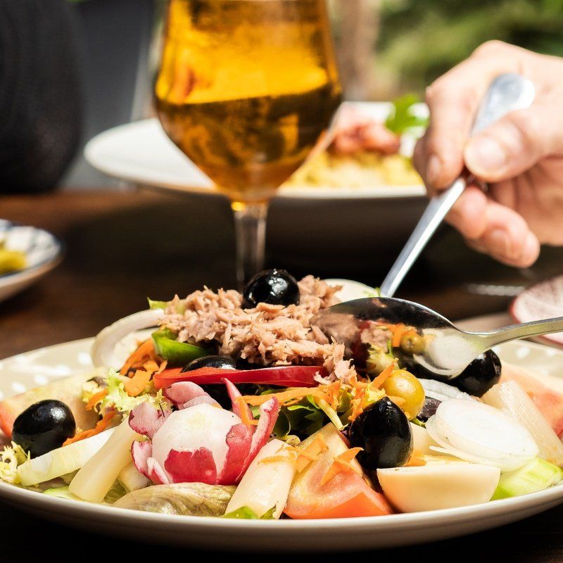 Ensalada verde con con hortalizas, espárragos, atún, huevo duro y vinagreta de Módena.