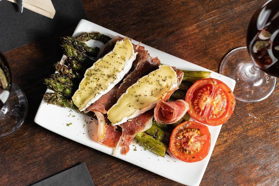Cazoleta de espárragos trigueros con jamón serrano y queso brie.